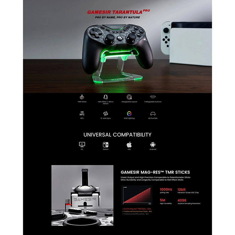 GameSir Tarantula Pro یک کنترلر حرفه ای و بی سیم مولتی پلتفرم است که با PC، iOS، Android و Nintendo Switch سازگار است. این دسته بازی مناسب گیمرهای حرفه ای و کسانی است که به دنبال تجربه ای دقیق، روان و راحت در بازی هستند.