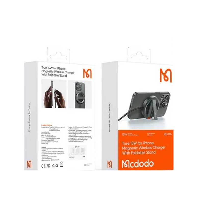 شارژر وایرلس Mcdodo CH-2330 از حداکثر جریان 15 وات برای آیفونهای سری 12، 13 و 14 برخوردار است و با گوشیهای معمولی با جریانهای 5W ،7.5W ،10W هم سازگار است.از قابلیت مگ سیف برخوردار است و 16 هسته مغناطیسی قدرتمند در ساختارش طراحی شده؛ کابلی به طول یک متر دارد و منبع تامین انرژی شارژر است.پروتکلهای شارژ سریع PD2.0/ PD3.0/ QC2.0/ QC3.0 را داراست و در کنار فست شارژ بودن شارژری ایمن را ارائه میدهد. دارای پایه نگهدارنده نیز میباشد.