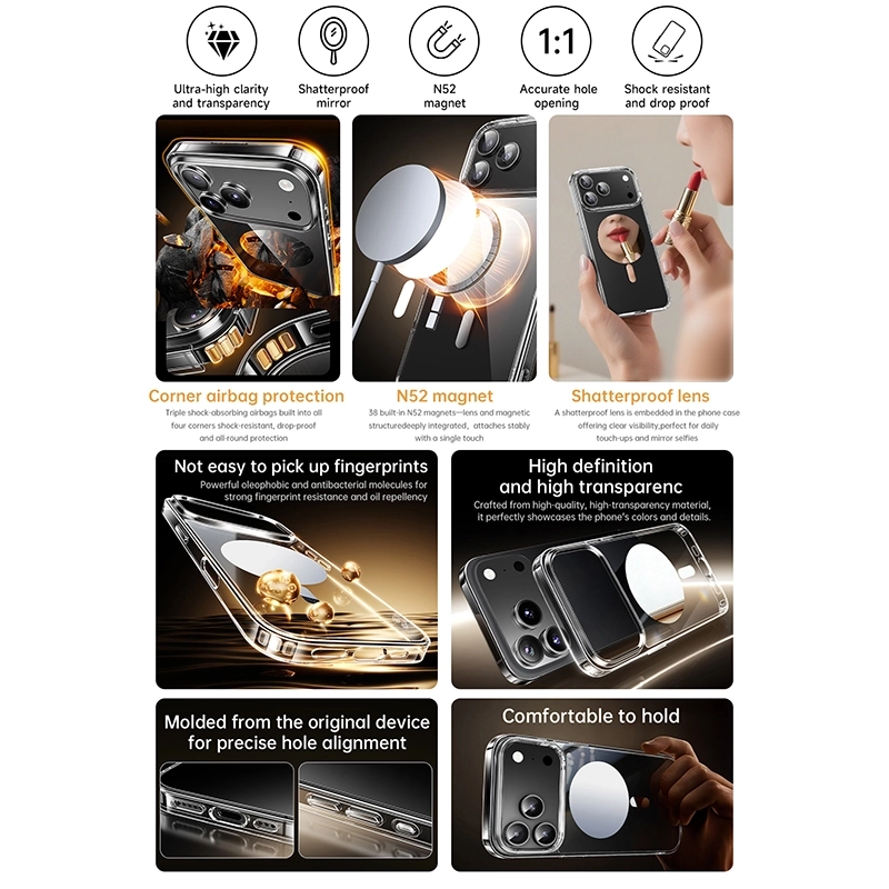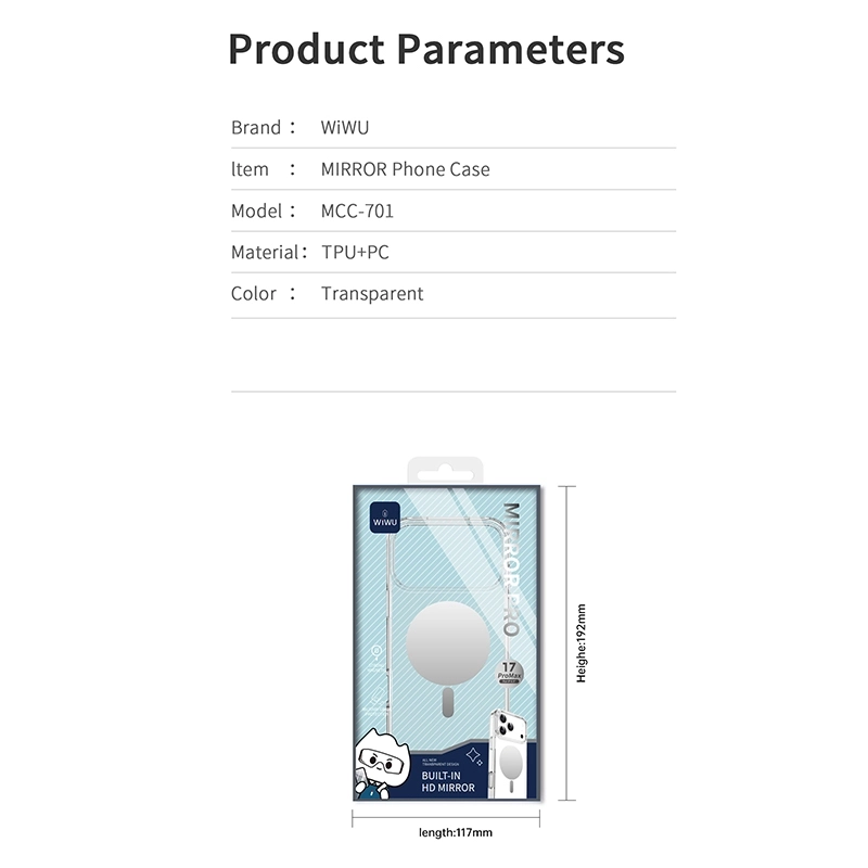 کاور ویوو Wiwu مناسب برای گوشی موبایل اپل iPhone 17 Promax دارای قسمت آیینه ای در قسمت مگ سیف / دارای قسمت تقویت مگ سیف پشت قاب / این قاب کیفیت بالایی دارد و مدت زمان طولانی میتوانید بدون زرد شدن قاب استفاده کنید / نوع متریال TPU+PC