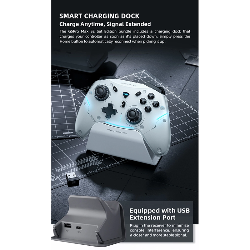 نسخه ویژه G5Pro Max SE همراه با داک شارژ اختصاصی ارائه می شود. کافیست دسته را روی داک قرار دهید تا به صورت خودکار شارژ شود. همچنین با فشار یک دکمه Home اتصال مجدد بسیار سریع انجام می شود.